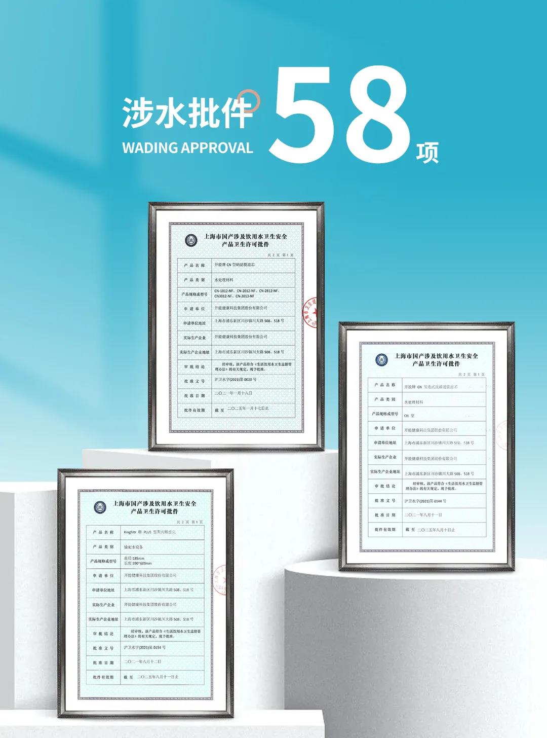 涉水批件全稱為“涉及飲用水衛生安全產品衛生許可批件”,是政府對生產涉及飲用水產品的企業頒發的,標志其衛生安全的唯一權威性文件。2021年,開能共獲得23項水批,在凈水市場競爭激烈的當下,開能始終堅持做安全有保障的產品,相信產品力的力量。