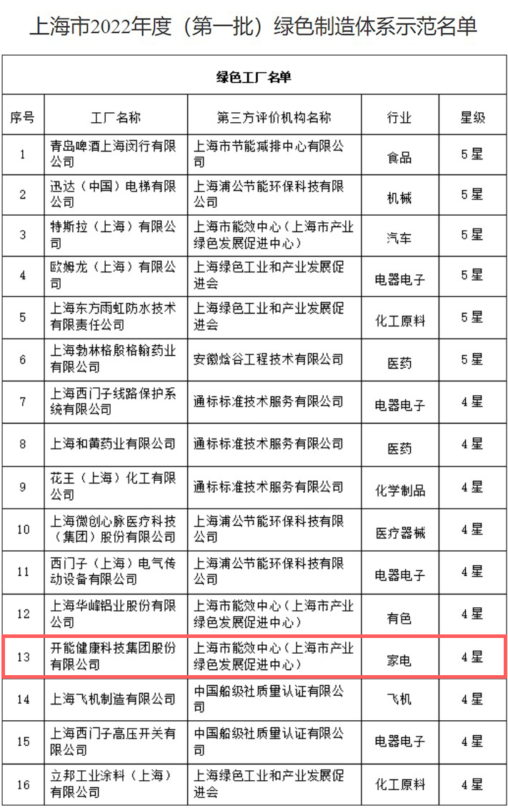 開能健康入選上海市2022年度(第一批)綠色制造體系示范名單
