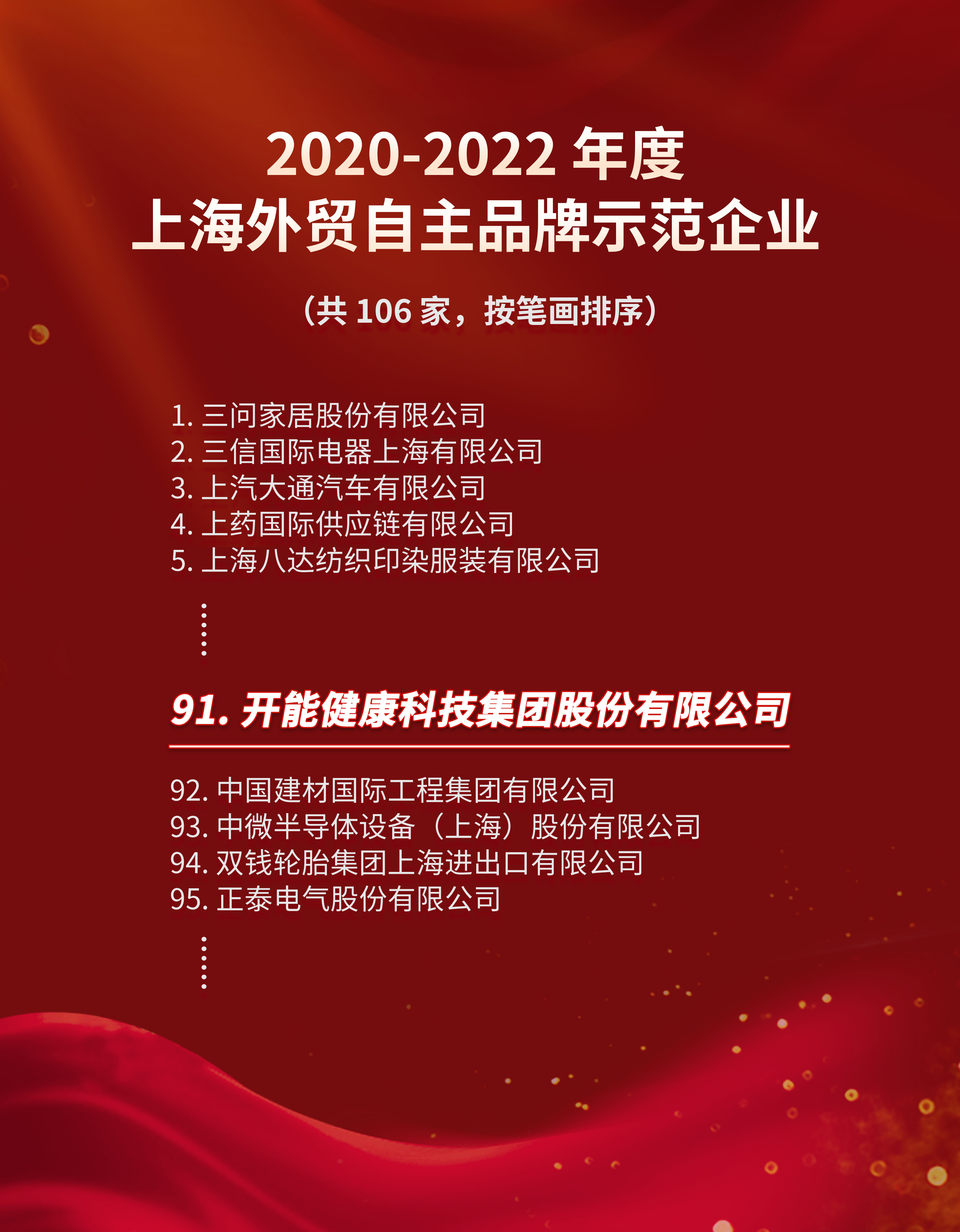 在上海市商務委員會的指導下,上海進出口商會根據“公開、公平、公正”原則,從研發創新能力、國際通行認證、市場銷售和消費者認可、知識產權保護、全球化經營、社會評價等6個方面進行綜合考量,最終確定了106家企業為2020-2022年度上海外貿自主品牌示范企業。開能健康憑借在國際市場上的競爭力入選,這也是繼2018-2019年度后開能再次入選。
