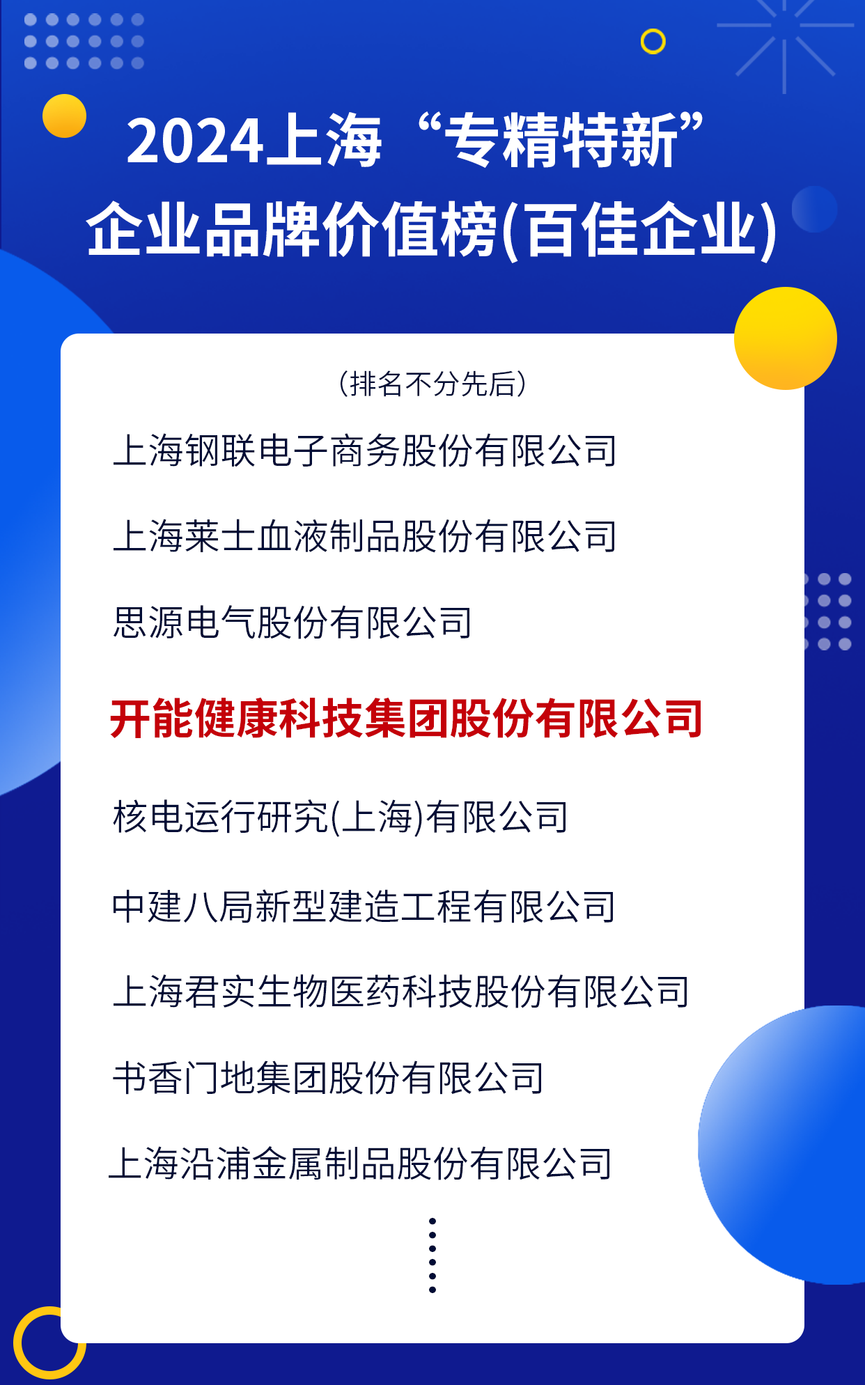 開能健康榮登上海專精特新企業品牌價值榜(百佳企業)